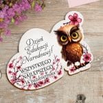 Ten wyjątkowy magnes wyróżnia się nietuzinkowym, heksagonalnym kształtem i przepiękną grafiką. Centralnym punktem nadruku jest urocza sówka w niebieskim birecie i muszce – odwieczny symbol mądrości, idealnie wpisujący się w szkolny klimat. Całość dopełnia eleganckie, chłodne tło z motywem róż oraz serdeczny napis „Wszystkiego najlepszego!”. Produkt o wymiarach 7,0 x 6,0 cm wykonaliśmy ze sztywnej i trwałej tektury introligatorskiej (1,5 mm). Precyzyjne cięcie laserowe oraz wysokiej jakości nadruk gwarantują niezwykłą estetykę. Dzięki mocnemu paskowi folii magnetycznej na rewersie, ten gotowy do wręczenia drobiazg staje się praktyczną ozdobą.